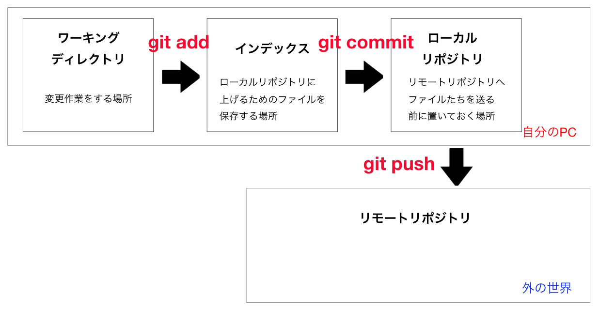 - git pushはそのファイルをローカルリポジトリからリモートリポジトリにあげるコマンド